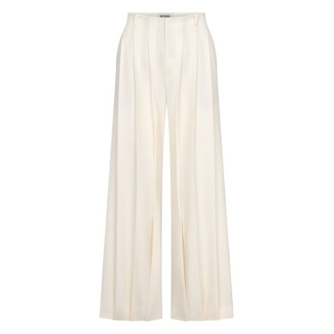 The Rossi Raya in offwhite is a wide-leg palazzo pant designed with a high waist for a flattering silhouette. Front pleats create a soft, fluid drape and add a refined touch to the overall look.