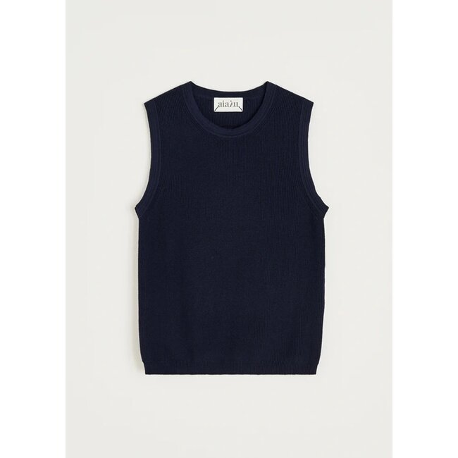 Een zachte, mouwloze top in een chique patentbreisel, gemaakt van biologisch katoen. Ontworpen in een regular fit met een ronde hals en afgewerkt met verfijnde, decoratieve rib- en randdetails.