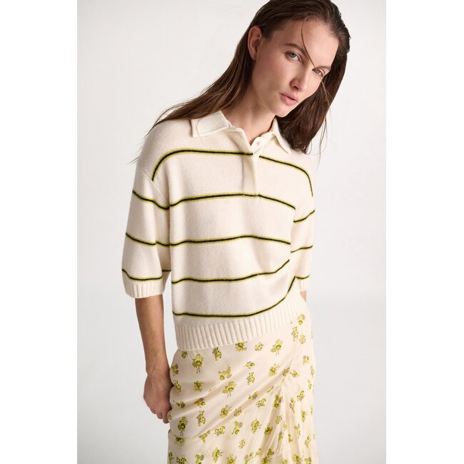 Sporting stripes: De merino-cashmere knit top heeft een contrasterende polokraag en knoopsluiting van katoen. Het boxy model is cropped en heeft wijde mouwen tot op de elleboog.