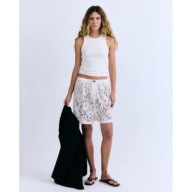 De Alfie Bermuda short in wit is een klassiek onderstuk met een elastische tailleband voor makkelijk aan- en uittrekken. Het Bermuda-model valt net boven de knie en zorgt voor een tijdloze uitstraling. Gemaakt van een katoenmix, biedt de short een comfortabele pasvorm.