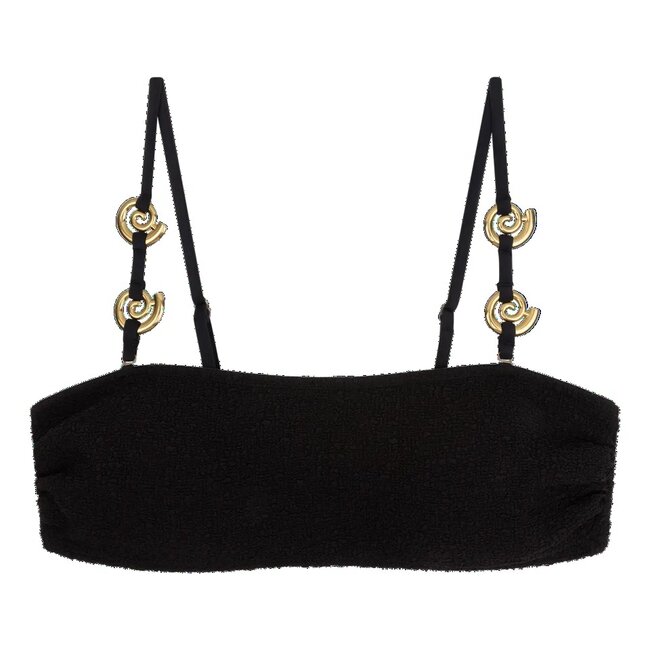 De Bond bandeau-bikinitop in zwart is een stijlvolle en veelzijdige keuze. Deze gevoerde top biedt medium ondersteuning en zorgt voor een comfortabele, maar veilige pasvorm. Afneembare extra bandjes maken het mogelijk je stijl eenvoudig aan te passen. Het metalen detail is huidvriendelijk en geschikt voor mensen met allergieën. De top is gemaakt van een zachte stof die glad en prettig aanvoelt op de huid. We raden aan dit item uitsluitend met de hand te wassen. Voor een optimale levensduur adviseren we het na het dragen uit te spoelen en in de schaduw te laten drogen om de kwaliteit te behouden.