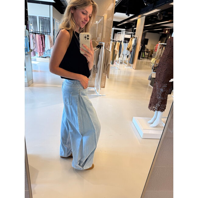 De denim met linnenmix voelt licht en luchtig aan, dus ideaal als het wat warmer is. De stof heeft een zachte, natuurlijke look en valt soepel. De subtiele plooien aan de zijkant geven ‘m net iets extra’s, zonder dat het te opvallend wordt.